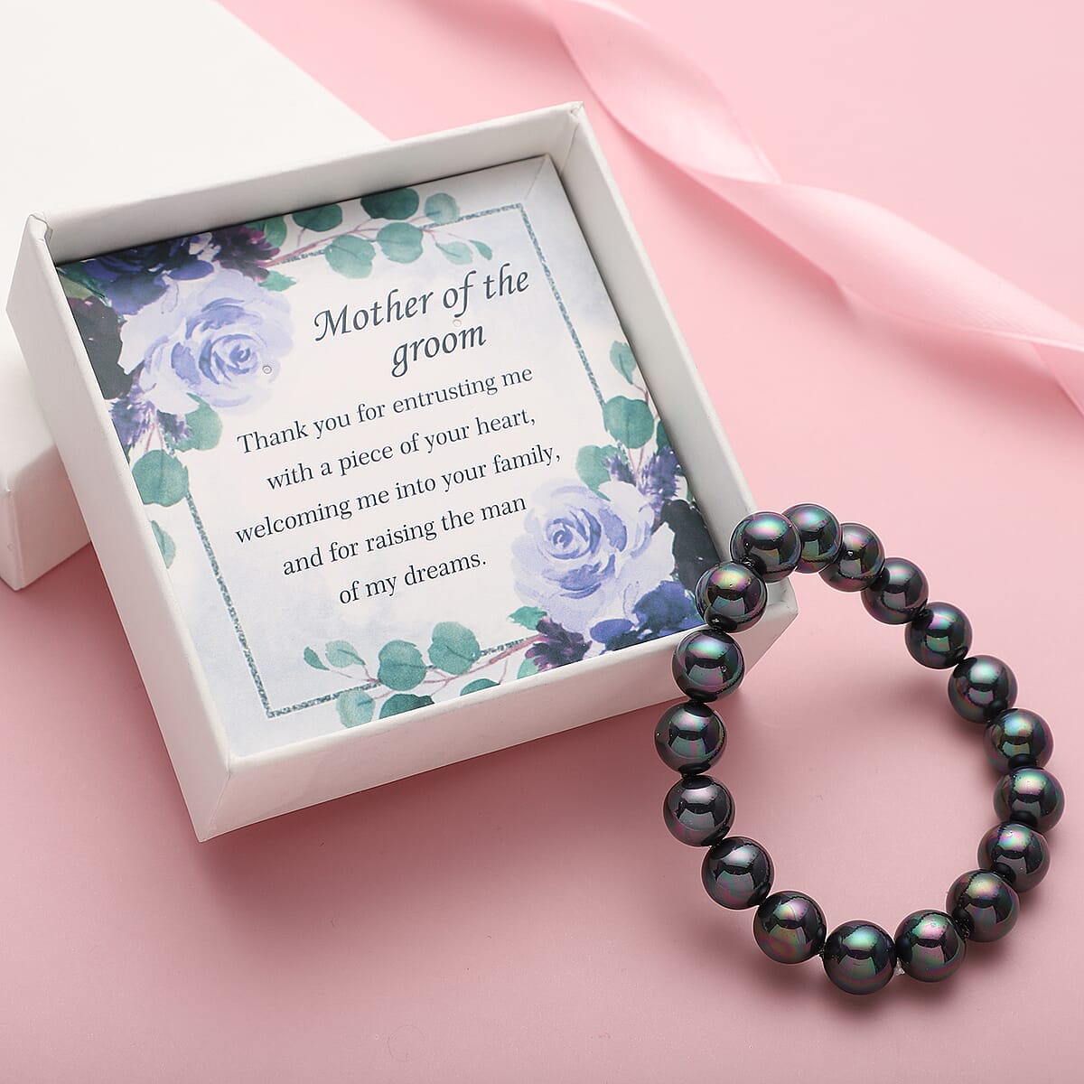 To the Mother of the Groom Jewelry Gift Set with Peacock Color Shell Pearl Beaded Stretch Bracelet