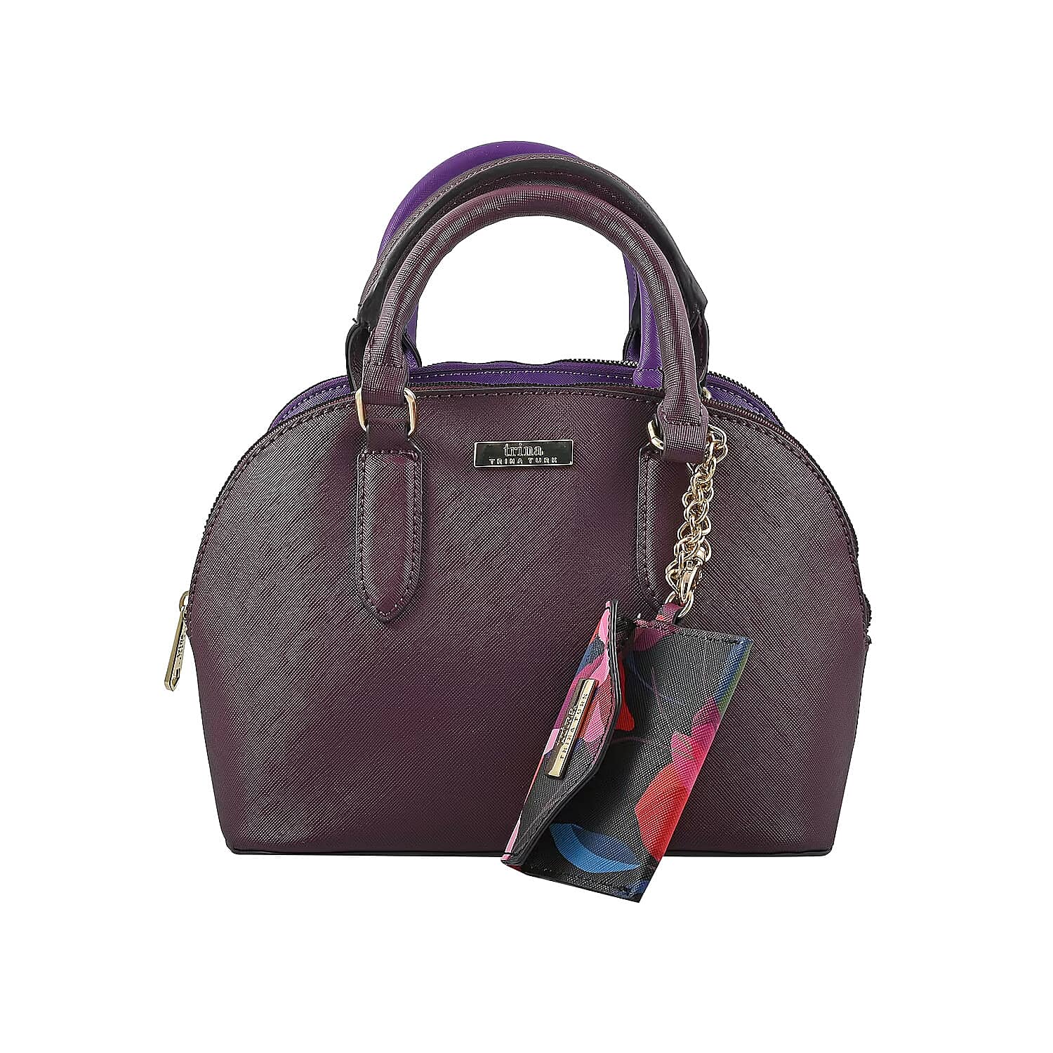 Elevate your look with the Trina Turk faux leather dome crossbody bag. Vibrant purple faux leather adds a bold pop to outfits. Its structured dome shape blends style with practical design. This vegan leather bag offers luxury with ethical fashion appeal.