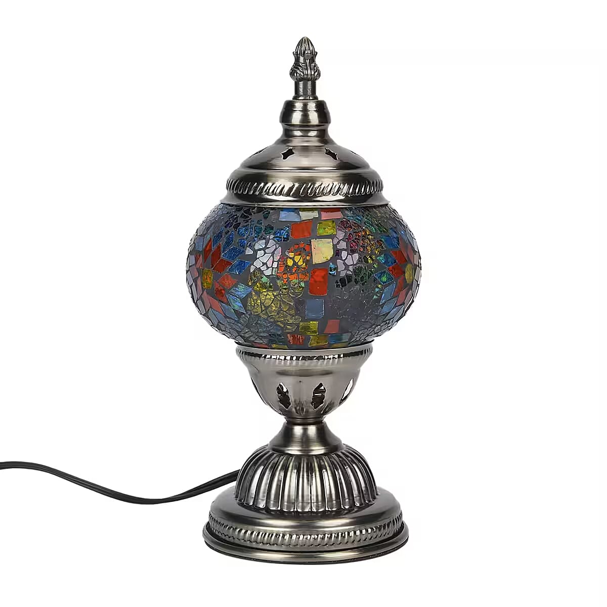The Turkish Moroccan glass mosaic table lamp features intricate glasswork with vibrant mosaic patterns, creating a stunning display of light. Designed as a decorative piece, it adds an exotic touch to any room. Its compact size makes it ideal for desks or side tables.