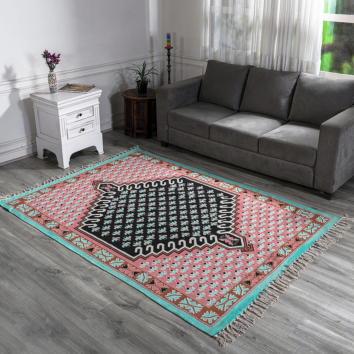 Turquoise & Black Screen Printed 100% Cotton Handloom Rugs