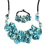 Turquoise Blue Seed Beaded Floral Necklace 20 Inches and Stretch Bracelet (8In) in Silvertone