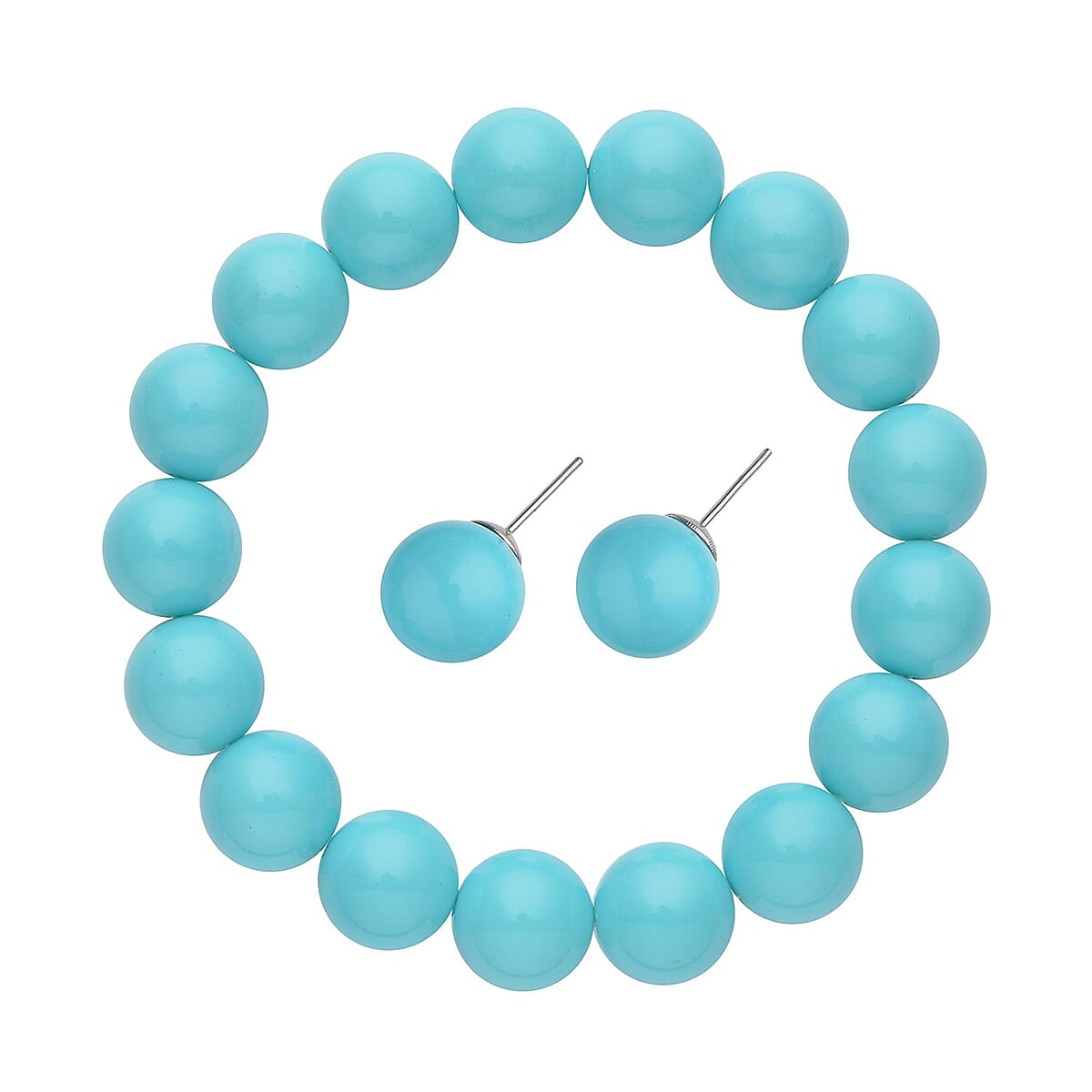 Turquoise Blue Shell Pearl 11-13mm Stretch Bracelet and Stud Earrings in Stainless Steel , Tarnish-Free, Waterproof, Sweat Proof Jewelry