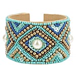 Turquoise Glass Seed Beaded Cuff Bracelet in Goldtone