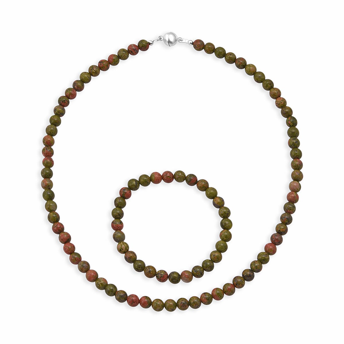 Unakite 200.00 ctw Beaded Stretch Bracelet and Necklace (18 Inches) in Sterling Silver