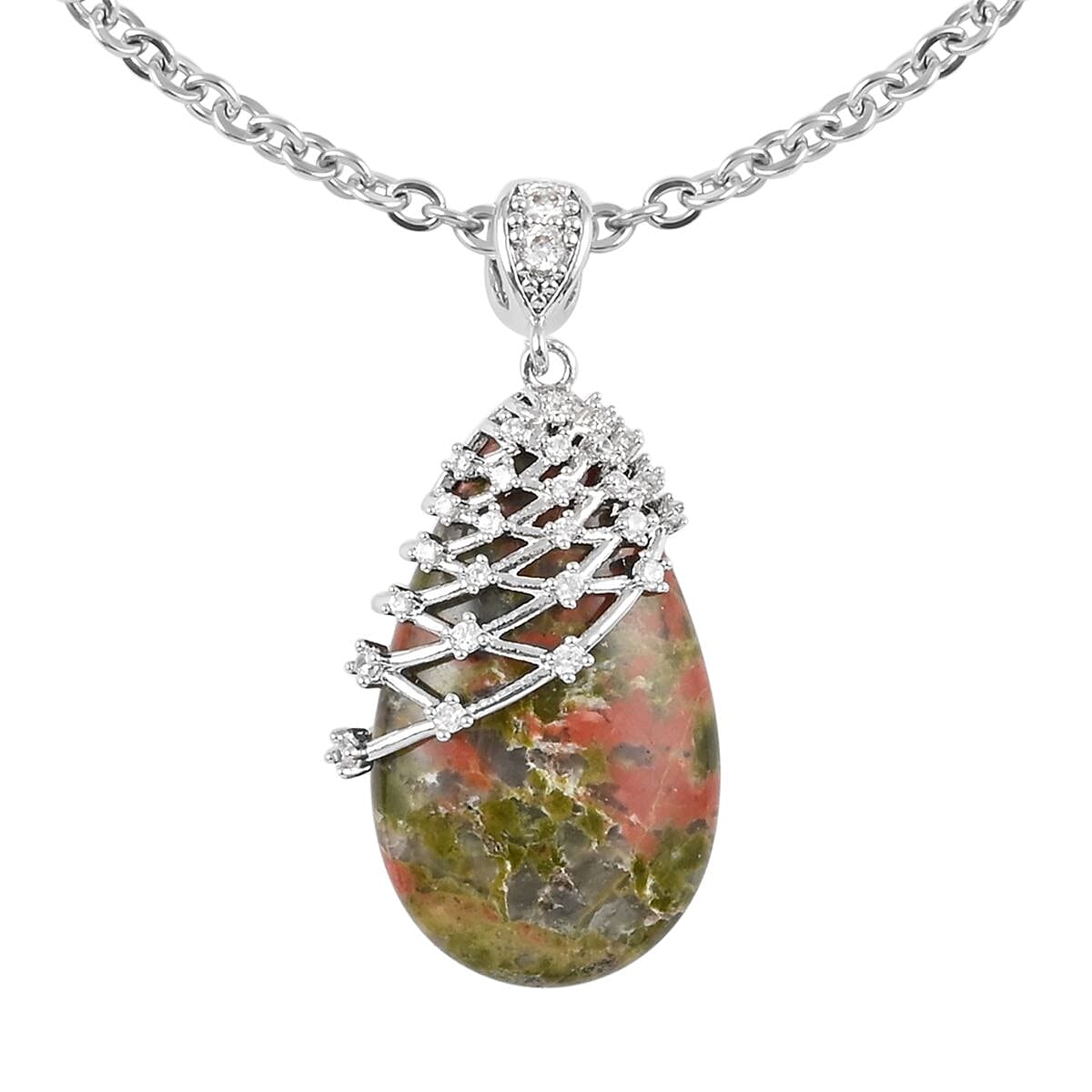 Unakite and White Zircon Pendant in Silvertone with Stainless Steel Necklace 18-20 Inches 21.00 ctw
