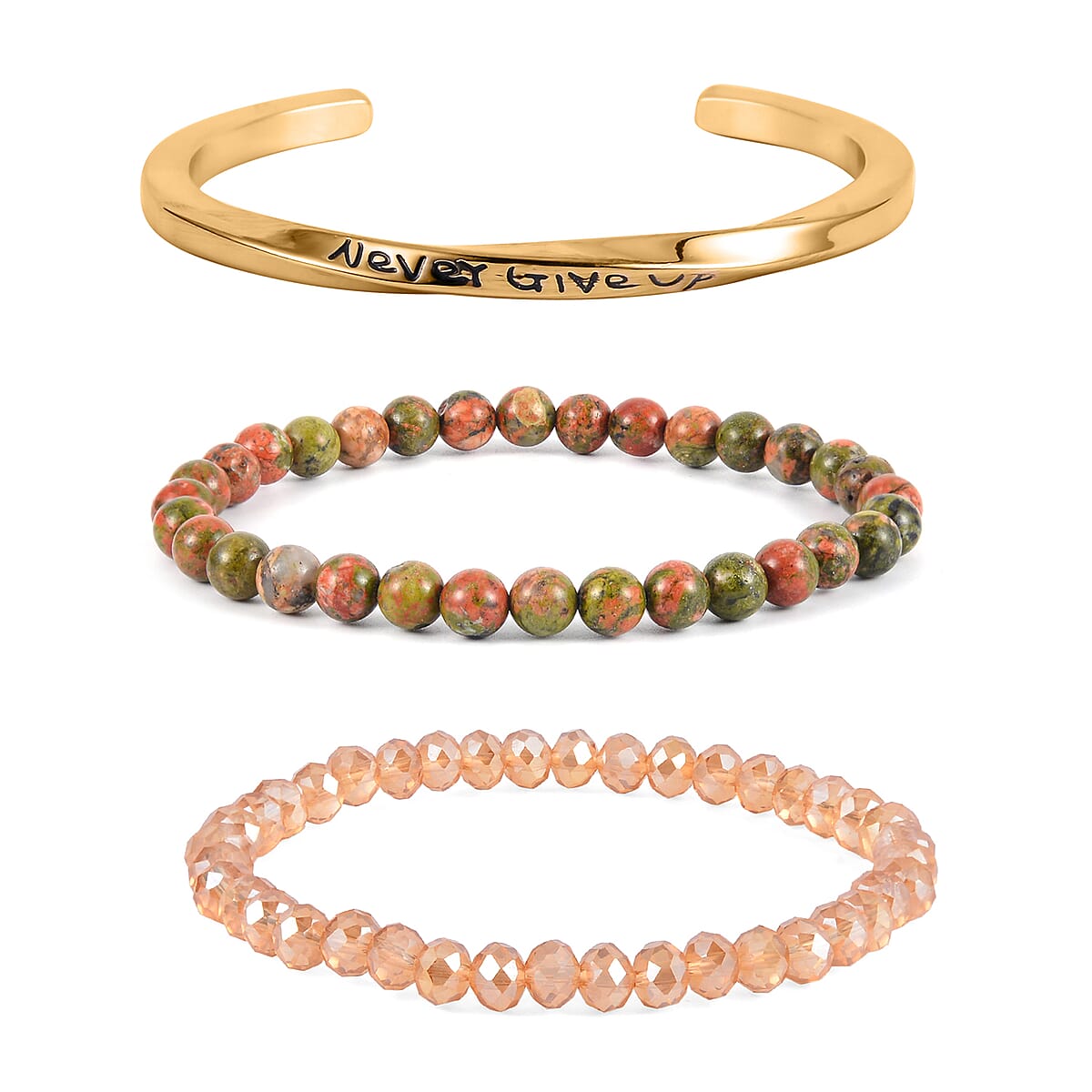 Unakite, Champagne Glass Set of 2 Stretch Bracelet and Cuff Bracelet (7.00In) in Goldtone 60.00 ctw