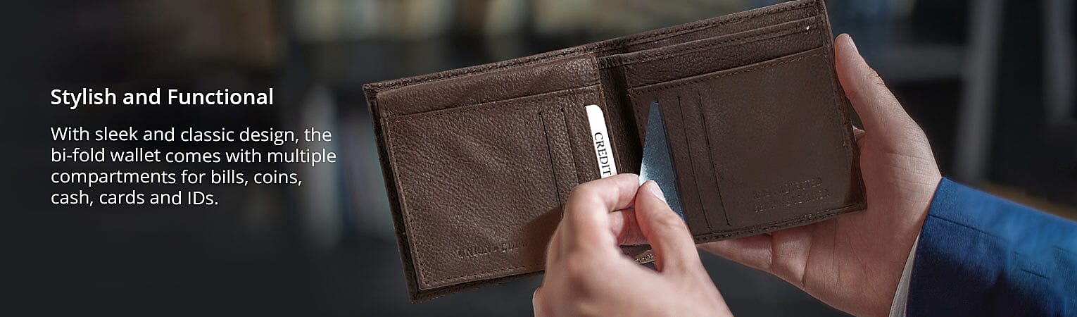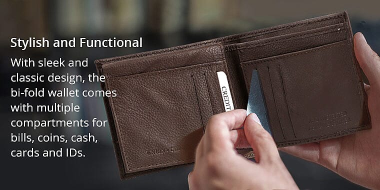 Showcase your stylish appearance by carrying this classic bi-fold men’s wallet from UNION CODE. It is made with genuine leather material and contains multiple pockets to store your notes, cards, identity documents, coins, and more. This wallet is convenient and portable to keep with you when heading outdoor, shopping, traveling, or more.