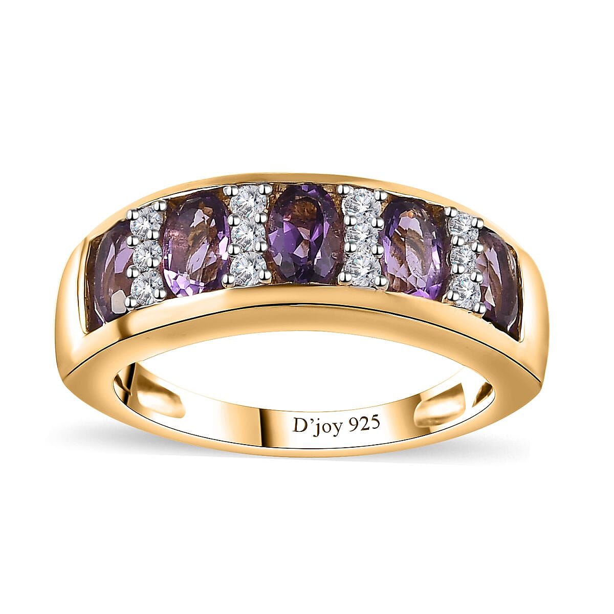 Enhance your jewelry collection with this exquisite Uruguayan amethyst and moissanite ring in 14K yellow gold over vermeil sterling silver. Featuring alternate set oval-shaped amethysts and round-shaped moissanites trio, this amethyst ring exudes elegance and sophistication. The prong setting ensures durability and allows the gemstones to sparkle brilliantly.