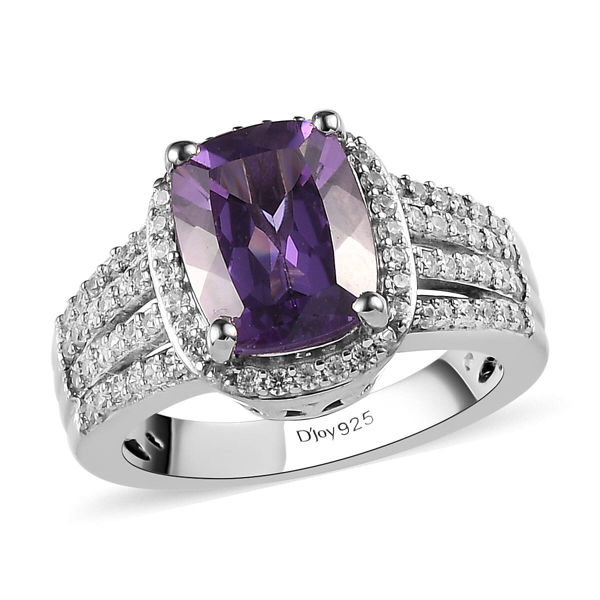 This Uruguayan amethyst and white zircon ring reflect the work of art. The halo theme inspires the design of this amethyst ring. This theme symbolizes warmth and brilliance. Amethyst is embellished in the center with white zircons accented on the contours and the ring shank. Uruguayan amethyst displays a rich, velvety look with intense deep purple color. This gem gets its color due to the presence of iron and aluminum with a uniform color display. Zircons intensify the remarkable sheen of the amethyst ring. Cushion-cut amethyst allows more light dispersion. This amethyst and zircon ring is gracefully designed in sterling silver with a luminous finish. The metal frame has a smooth texture and is hypoallergenic. This purple halo ring will glam up your diva look.