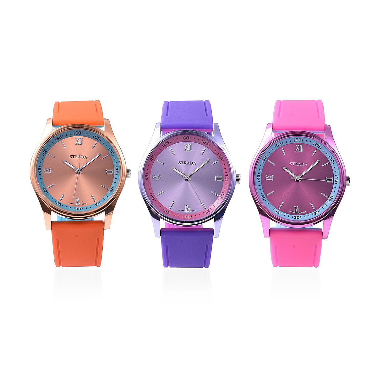 Value Buy Set of 3 Strada Japanese Movement Multi Color Watches with Silicone Strap & Stainless Steel Back