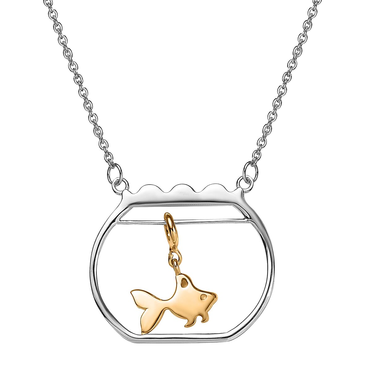 Dive into a world of tranquility with our gold fish swimming bowl necklace, a symbol of peace and elegance. This exquisite piece, with its intricate metalwork inspired by the serene aquatic life, is crafted in vermeil yellow gold and platinum over sterling silver. The 18-inch Princess Length Necklace gently encircles your neck, secured with a lobster clasp and chain extender. It's not just a necklace; it's a statement of serene beauty.