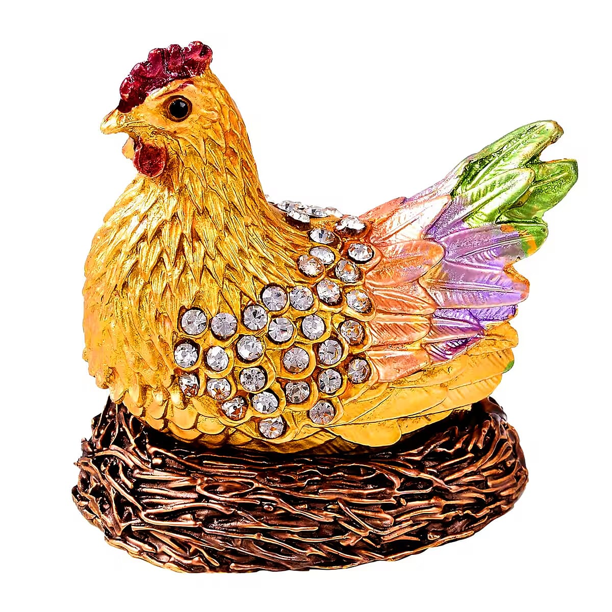 White and Black Austrian Crystal, Enameled Hen Trinket Box in Goldtone