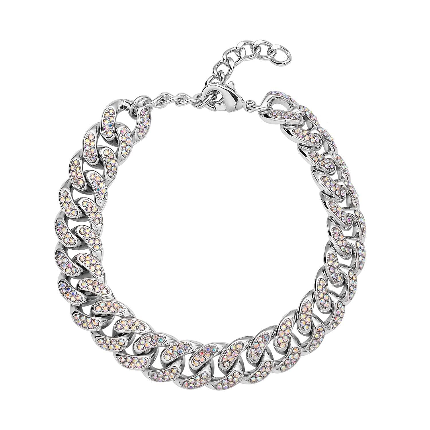White Aurora Borealis Austrian Crystal Curb Link Chain Bracelet in Silvertone (7.50-9.50In)