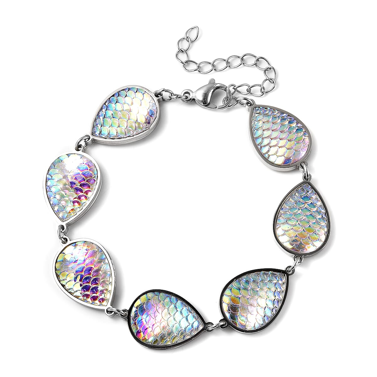 White Aurora Borealis Resin Disco Ball Pear Charm Station Bracelet in Stainless Steel (7.75-9.95In)