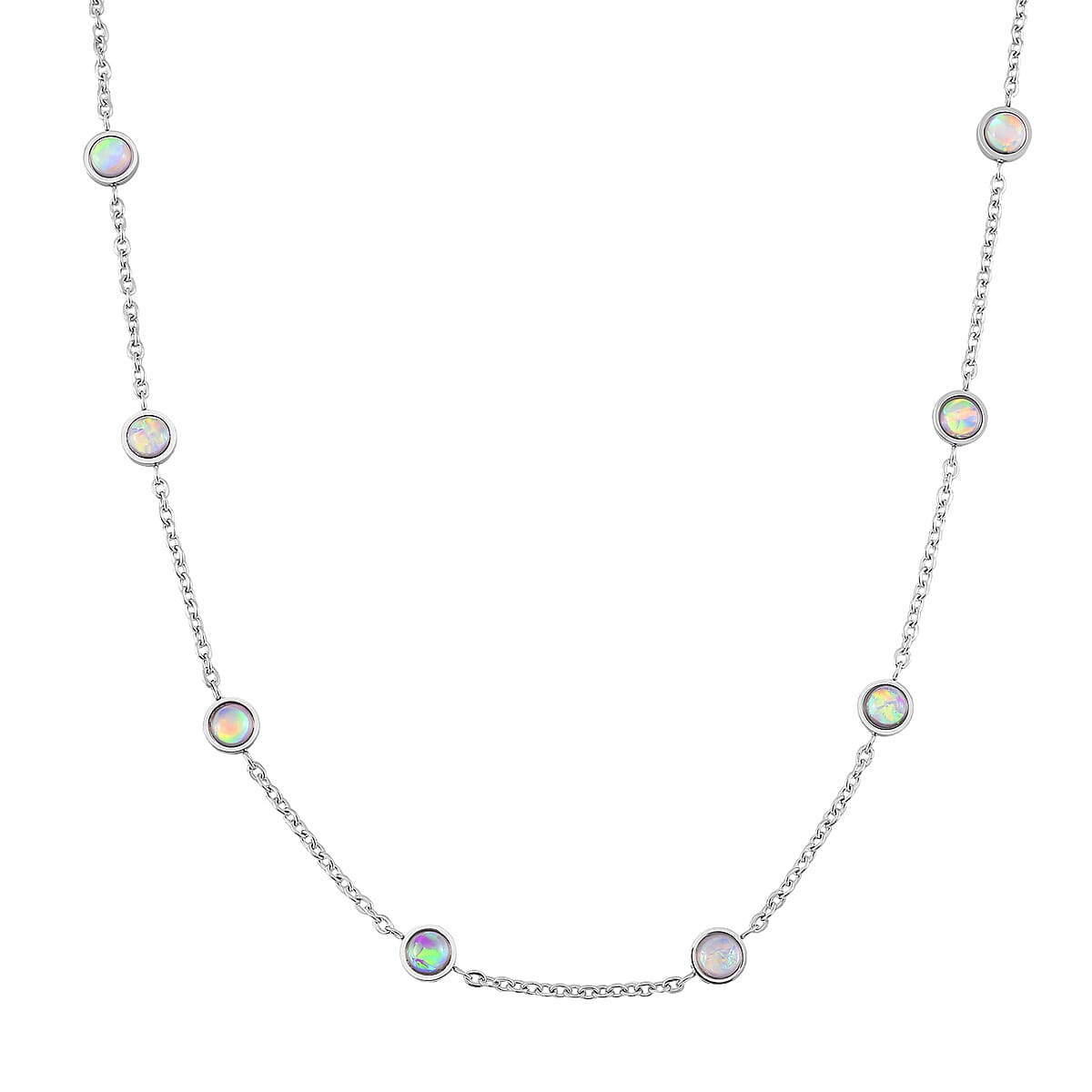 Elevate your style with this simulated opal resin necklace in stainless steel. This station necklace features vibrant simulated opal stations. The opals shimmer with every movement, creating a captivating look. A sophisticated design that effortlessly elevates any outfit, making it a must-have piece.