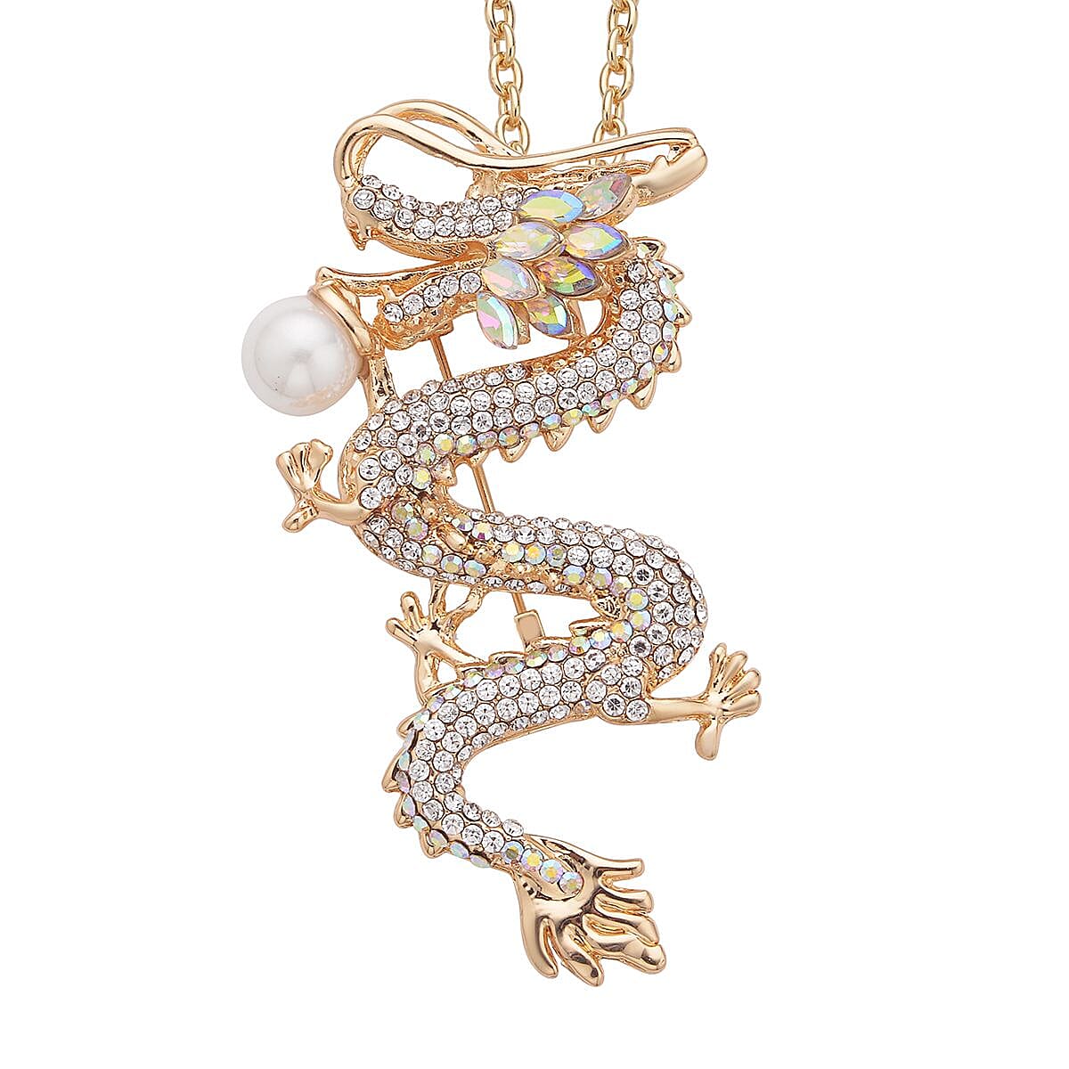 White Austrian Crystal and White Resin Dragon Pendant Necklace 28-30 Inches in Goldtone