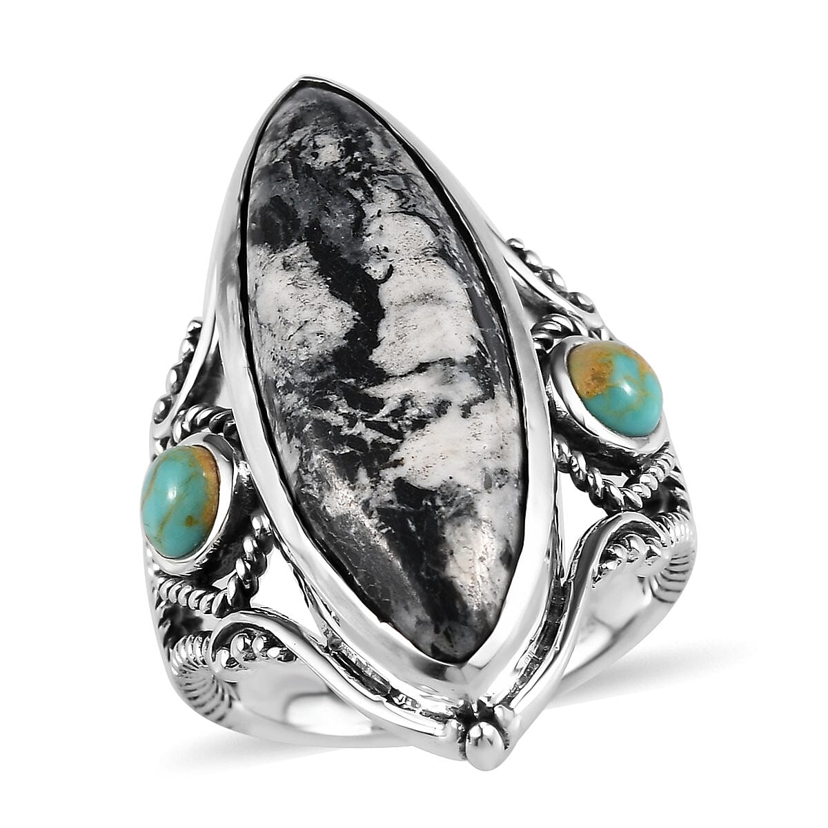White Buffalo and Royston Turquoise Elongated Ring in Sterling Silver (Size 10.0) 10.75 ctw