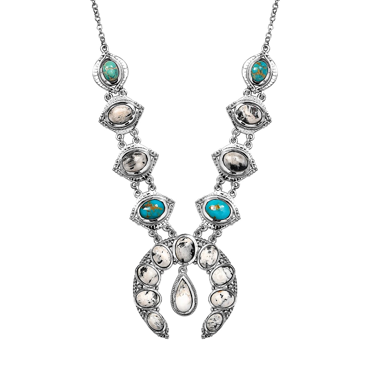Displaying exquisite artisan craftsmanship, this American Natural White Buffalo and South Hill turquoise squash blossom necklace symbolizes one's status, wealth and cultural belonging. As an iconic Southwestern necklace, this piece features American Natural White Buffalo studded crescent-shaped charm with a drop dangling in the center, known as the naja. This crescent-shaped symbol is believed to have originated in the ancient Middle East as a talisman worn to ward off evil. This charm is hung on a designer, American Natural White Buffalo and South hill turquoise studded collar frame attached to the chain. The squash blossom necklace is often recognized as being rooted in the Southwest jewelry traditions of the Diné people. The color of American natural white buffalo is milk white to pale yellow with brown and sometimes black inclusions. The metal artistry of this necklace adds exceptional allure to the gemstone accents. Drenched in platinum-plated sterling silver, this necklace features 18 inches of princess length.
