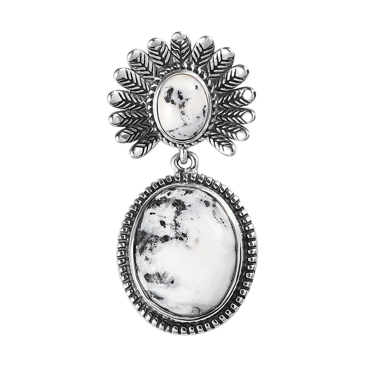 Artistically designed, this American natural white buffalo pendant is a masterpiece. The designer metallic frame features American natural white buffalo adornments highlighting exquisite gemstone beauty. The tradition of wearing a white buffalo pendant brings good luck and symbolizes protection. The color of American natural white buffalo is milk white to pale yellow with brown and sometimes black inclusions. The Native American origins and history of white buffalo turquoise make it an exceptionally unique stone. The jewelry is crafted in sumptuous sterling silver to veil your neckline in true elegance.