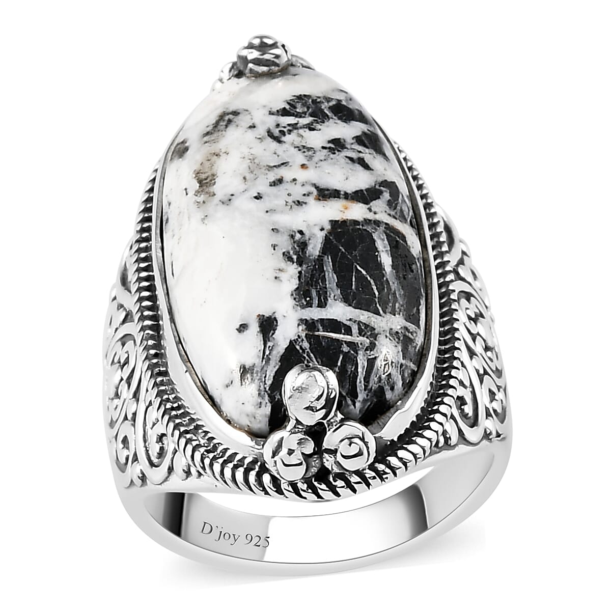 Based on the classic solitaire theme, this natural white buffalo ring is the epitome of grace and sophistication. Solitaire rings are symbolic of one love and one commitment. Made in sterling silver, this solitaire ring features a large pear-shaped natural white buffalo gem set in the bezel setting. The ring has been further beautified by adding fine artistic details all over it. The details are extensively polished by experts to ensure a smooth look and clean detail. This beautiful solitaire natural white buffalo ring can be worn with your casuals as well as festive outfits to look gorgeous. White Buffalo is a gemstone that is single mined Tonopah, Nevada by the Otteson family.
