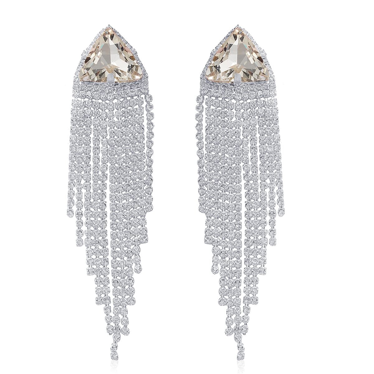 The gleaming white glass dangle chain tassel earrings show the expression of your cheerful, bright, and optimistic attitude. With white Austrian crystal on the top, these earrings are enough to catch the limelight of the party. These earrings are crafted in a durable Silverstone material that makes the piece last longer.