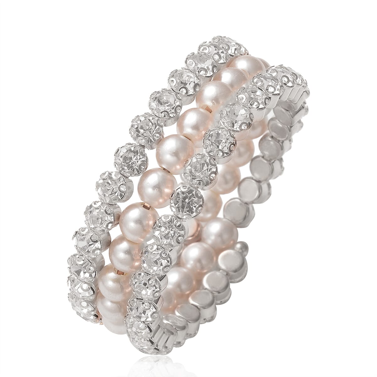 White Crystal, Simulated Pearl Bangle Bracelet in Silvertone (6.00 In)