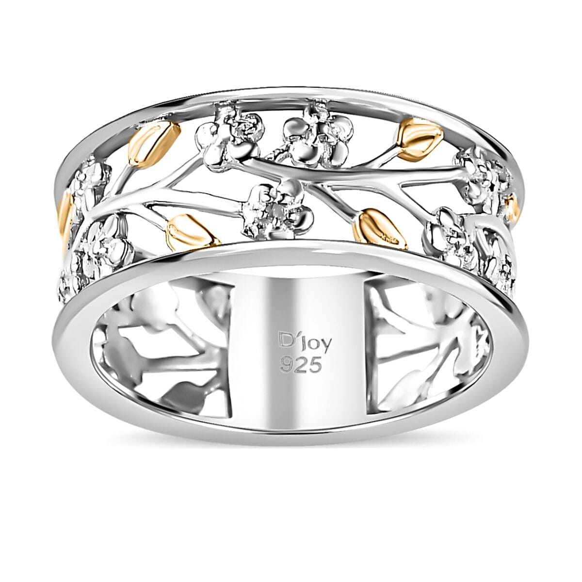This white diamond accent ring perfectly blends nature-inspired beauty and masterful artistry. The floral design band ring features a smooth open metal design in dual-tone.