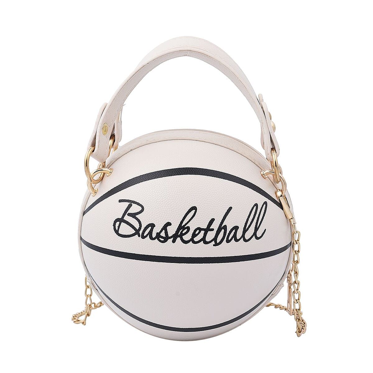 White Faux Leather Basket Ball Shaped Crossbody Bag with Double Handle Drop and Chain Shoulder Strap