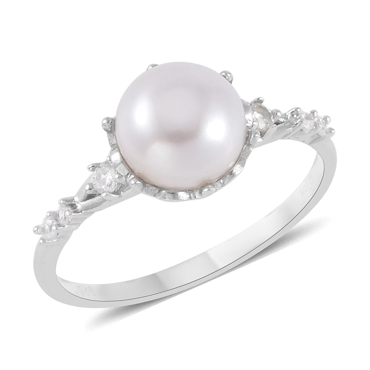 White Freshwater Cultured Pearl and Simulated Diamond Ring in Rhodium Over Sterling Silver (Size 7.0) 0.10 ctw