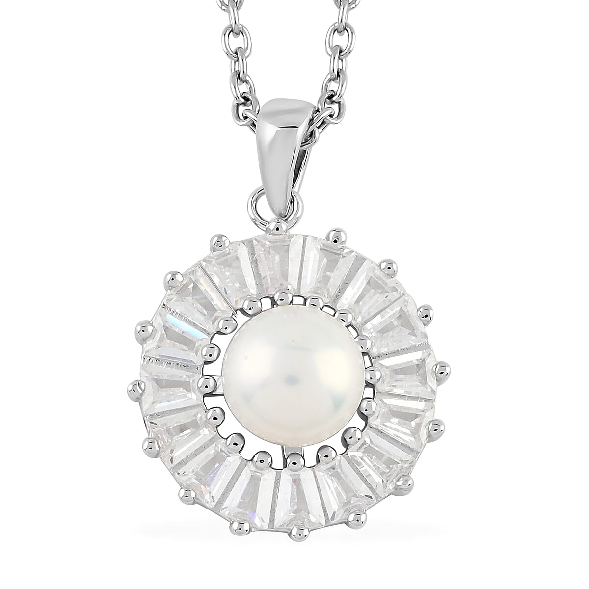 White Freshwater Pearl and Simulated Diamond Floral Pendant Necklace 20 Inches in Rhodium Over Sterling Silver and Stainless Steel 1.00 ctw