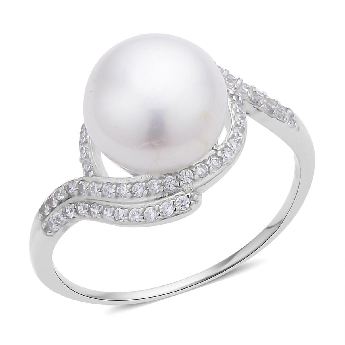 White Freshwater Pearl and Simulated Diamond Ring in Rhodium Over Sterling Silver (Size 10.0) 0.35 ctw
