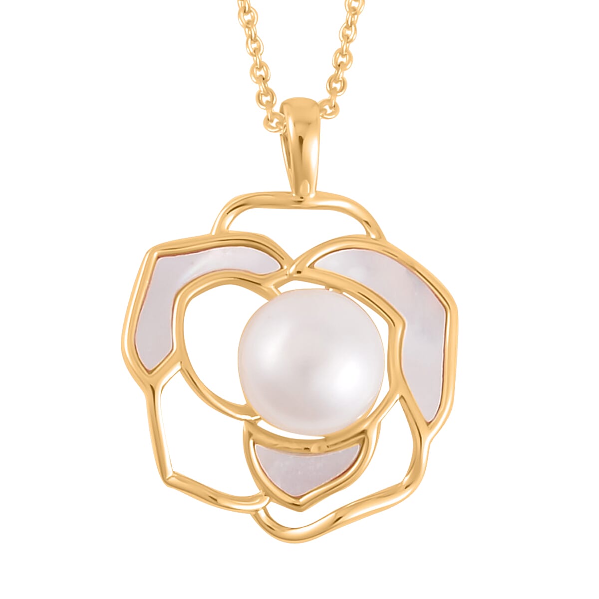 White Freshwater Pearl and White Mother Of Pearl Pendant Necklace 20 Inches in Goldtone