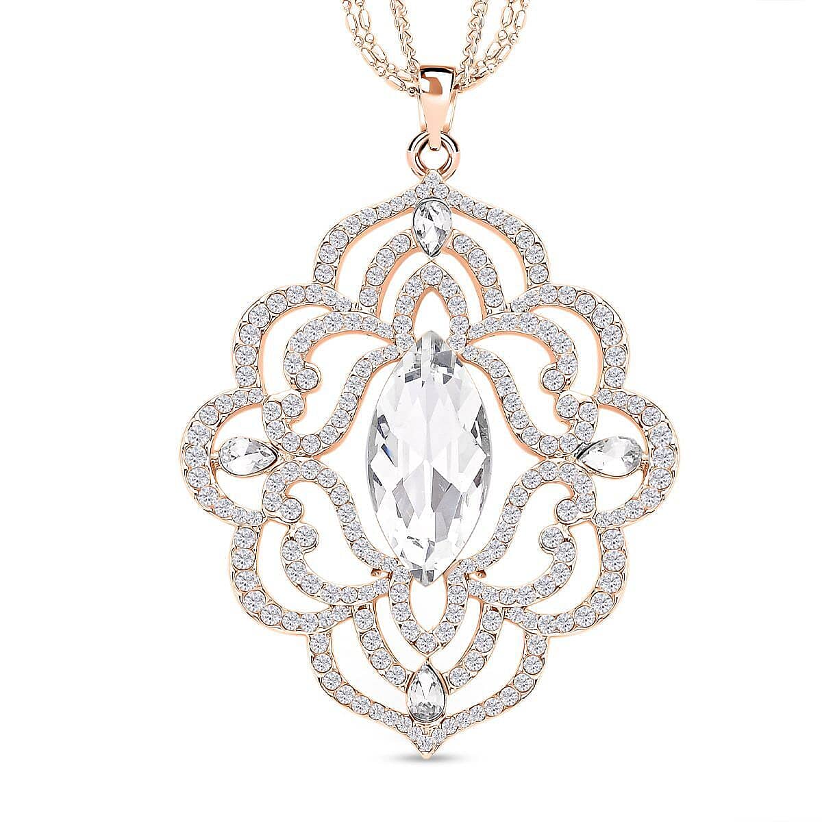White Glass and Austrian Crystal Pendant Necklace 28-30 Inches in Rosetone