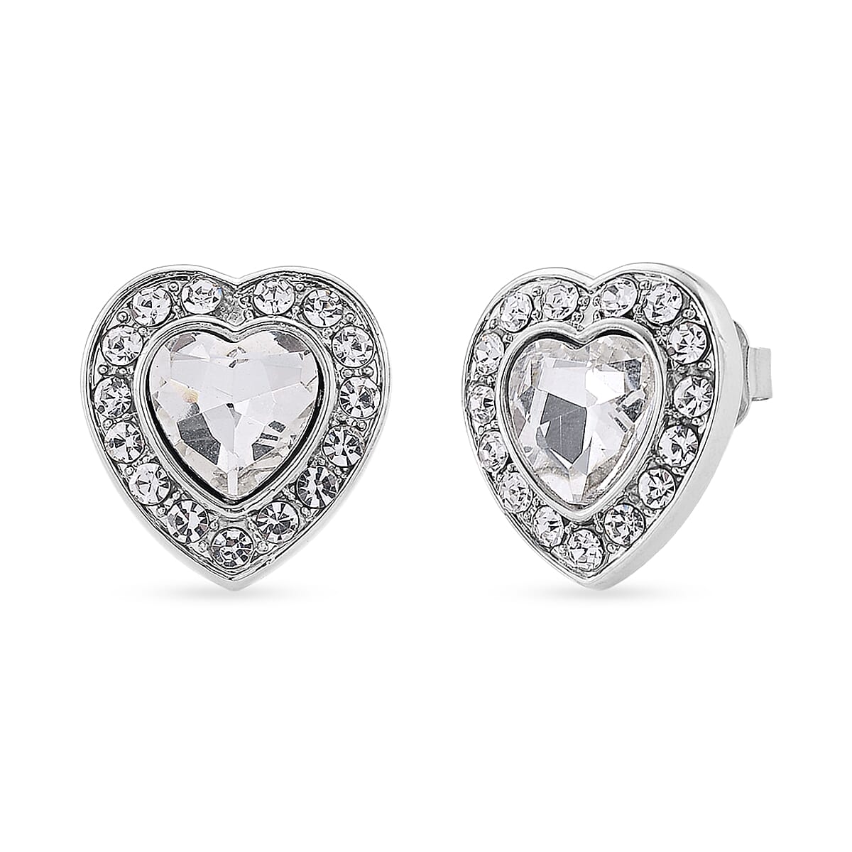 White Glass and Austrian Heart Stud Earrings in Silvertone and Stainless Steel