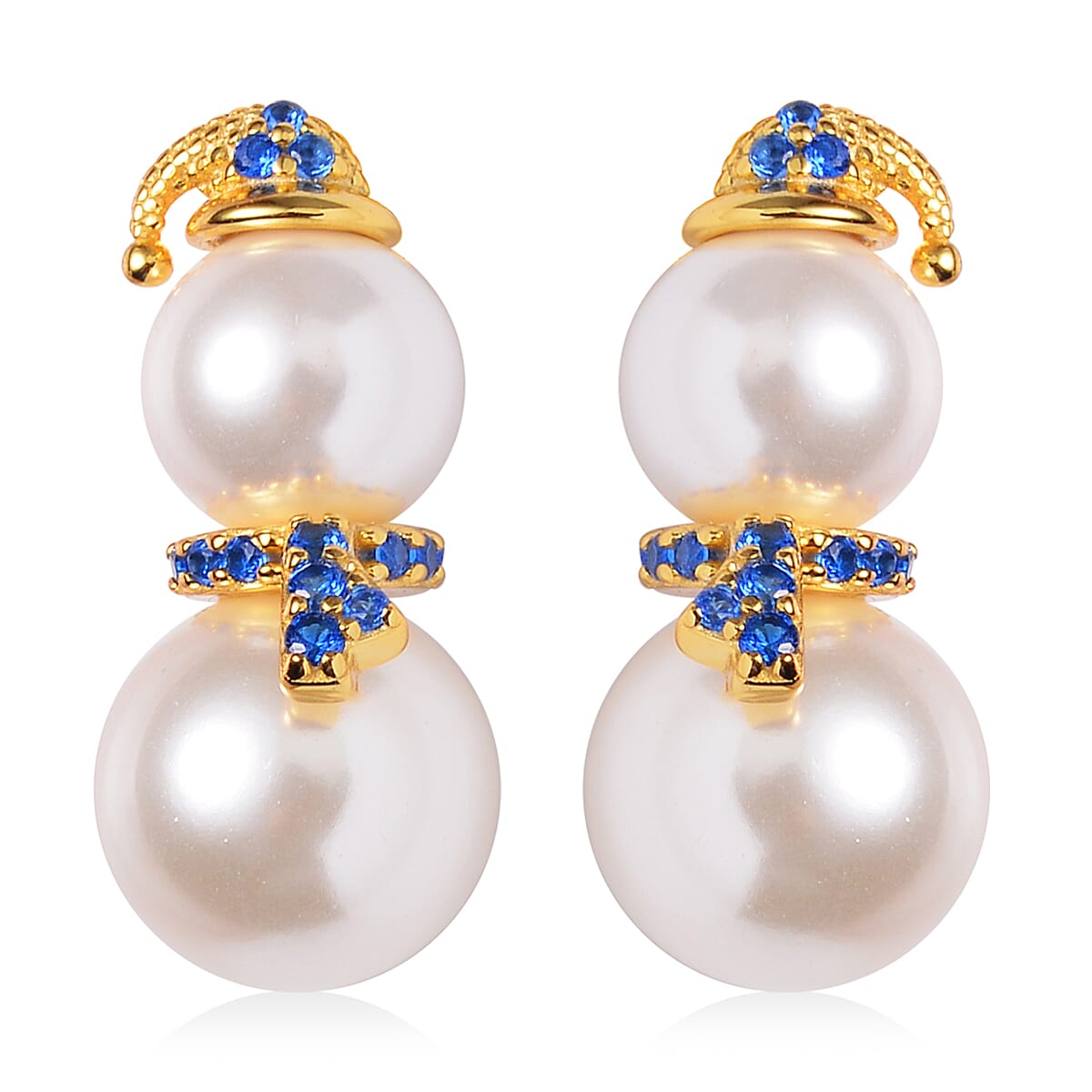 White Shell Pearl and Tanzanian Blue Spinel (DF) Snowman Earrings in 14K Yellow Gold Over Sterling Silver 0.35 ctw
