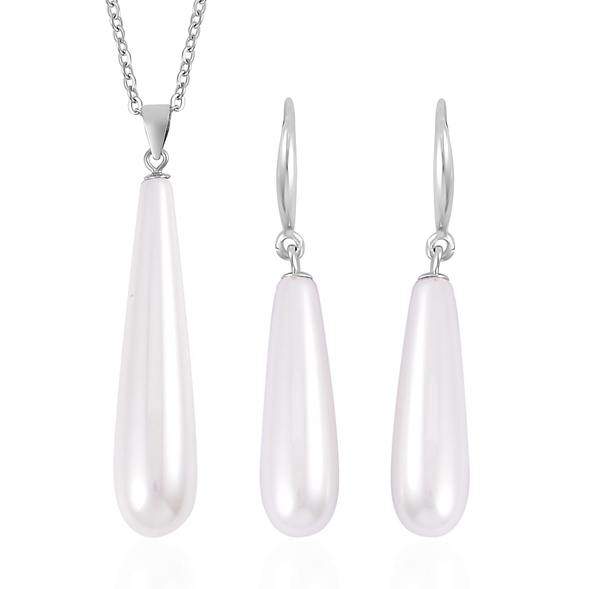 White Shell Pearl Drop Pendant Necklace 20 Inches and Earrings in Stainless Steel