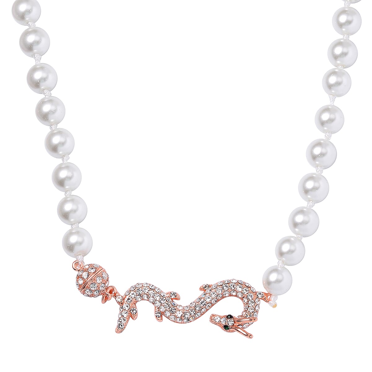 White Shell Pearl, Green and White Austrian Crystal Dragon Necklace in Rosetone 20 Inches