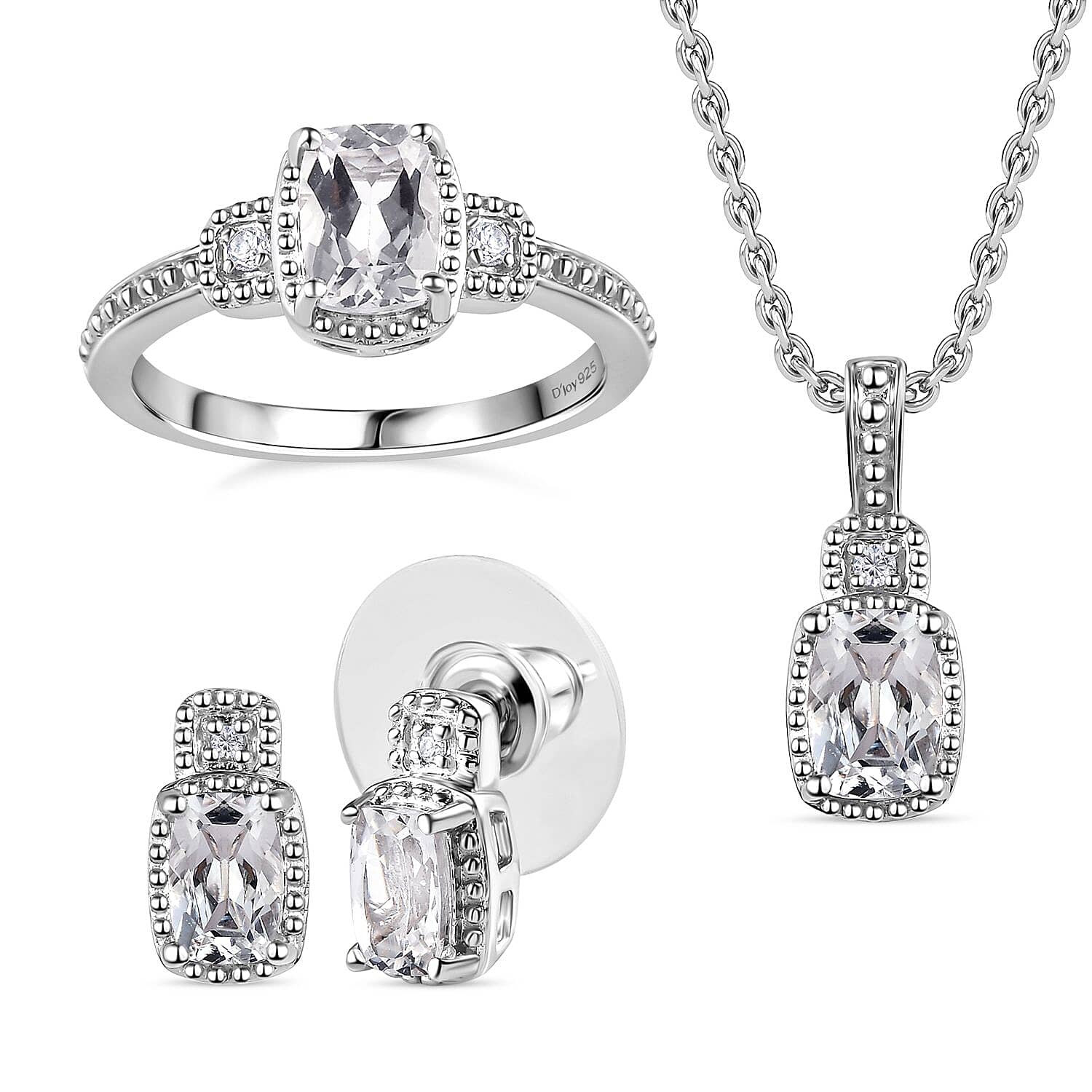 Discover the timeless elegance and unified charm of our set of three women’s jewelry in silver, meticulously crafted to bring you a harmonious blend of style and sophistication. This exquisite set includes a gemstone ring, gemstone pendant, and gemstone earrings, each featuring a cushion-shaped focal gem accented by same-colored gemstone rounds. The intricate milgrain work adds a touch of vintage charm, while the platinum over sterling silver and stainless steel necklace ensures durability and shine. This 20-inch necklace set is a testament to enduring beauty and elegance, perfect as a gift or a splendid addition to your collection.