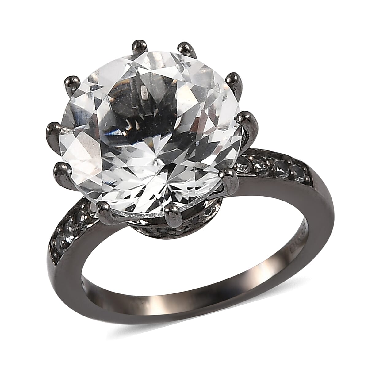 This white topaz ring is a bold and striking piece of jewelry. This sterling silver ring features a round white topaz gemstone as the centerpiece. The ring is made of sterling silver with black rhodium plating, which gives it a sleek and modern look. The white topaz in the center is set perfectly in ten prongs adding to the ring's overall appeal. This silver topaz ring is perfect for someone who wants to make a statement with their jewelry and is looking for a unique and eye-catching accessory.