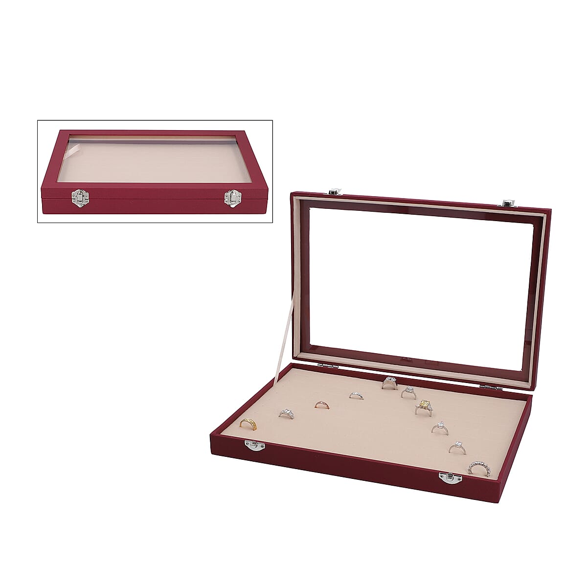 Wine Red Leatherette Paper 100 Slot Ring Box with Anti Tarnish Lining & Latch Clasp