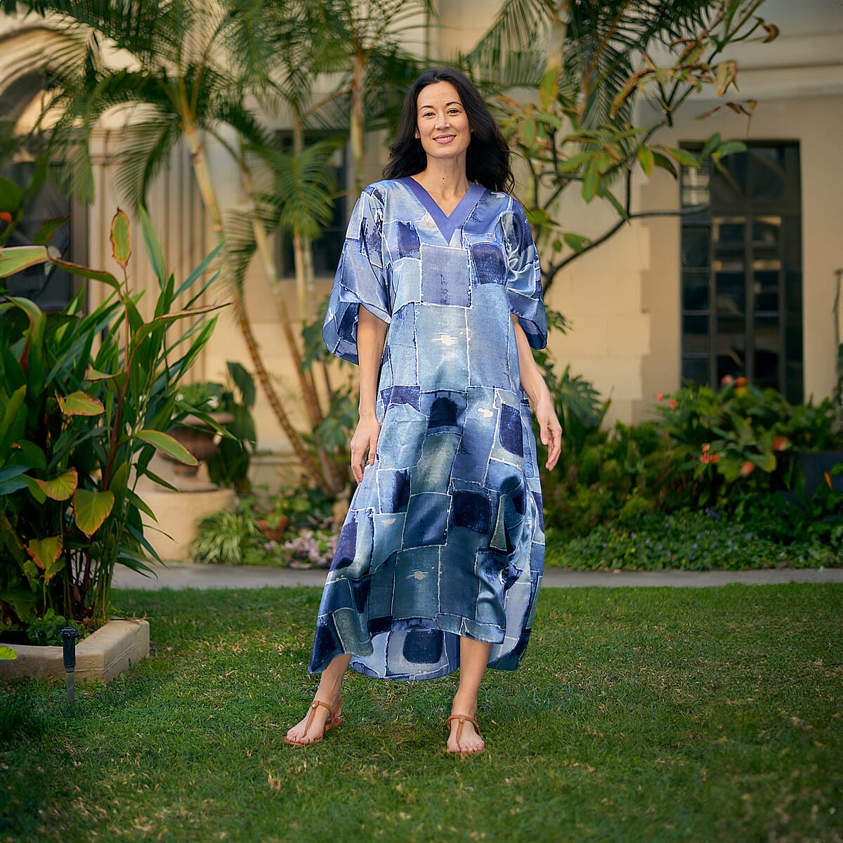 Winlar Blue Square Satin Maxi Kaftan - One Size Fits Most