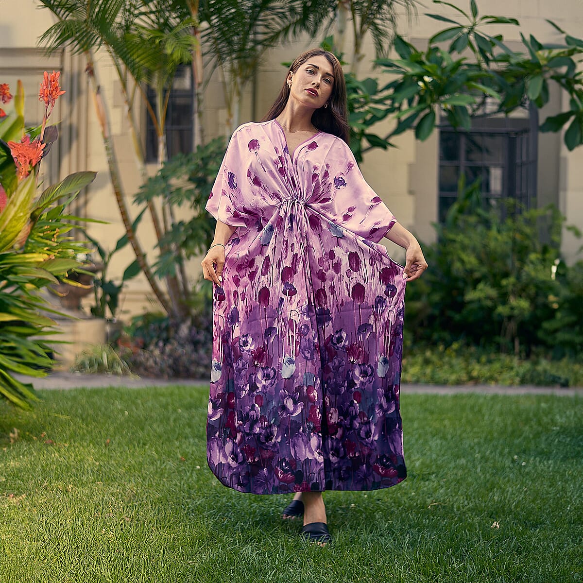 Winlar Purple Floral Satin Maxi Kaftan with Drawstring Waist - One Size Fits Most