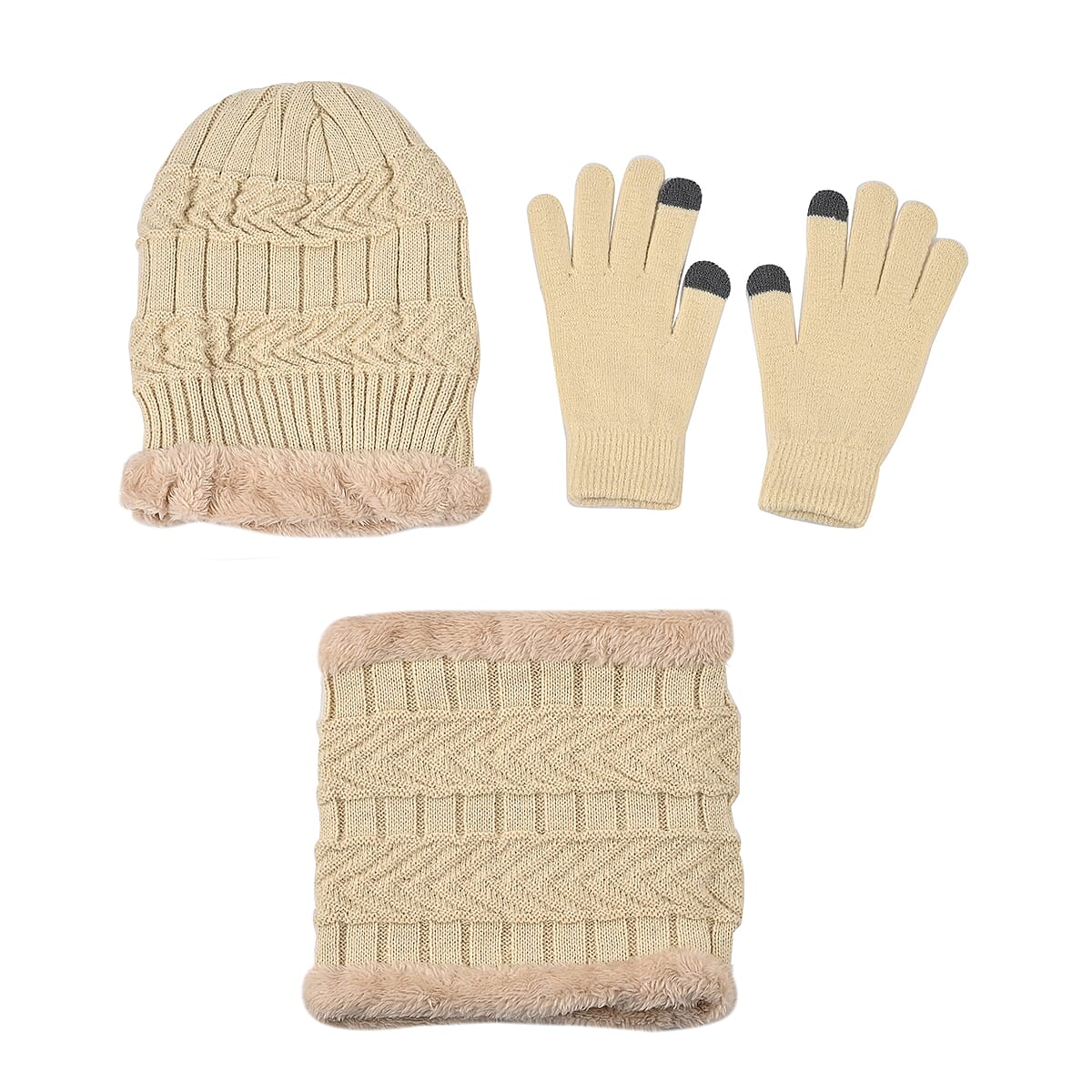 Winter Thick Fleece Lined Beanie Cap Hat Neck Warmer Scarf and Touch Screen Supported Mittens Gloves Set for Men's and Women's - Cream (3pcs Set)