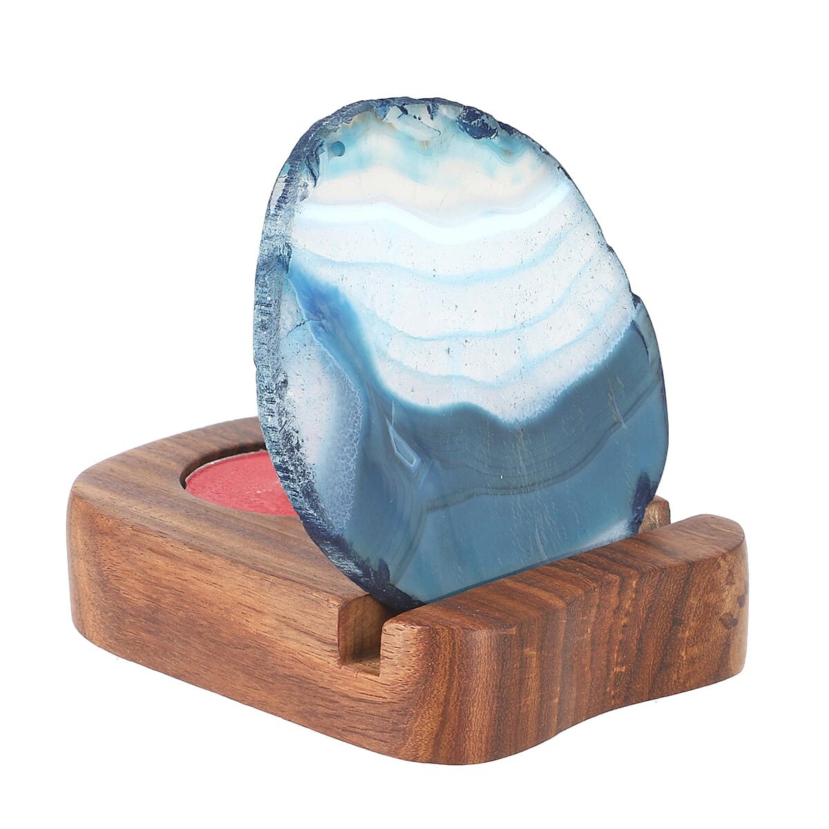 The thinly sanded agate disc allows the light of the tea light to be warmed up in a meaningful way. The agate disc comes with a wooden stand and tea light and can be stood up and tried out. Agate is a distant cousin of sand, is a semiprecious stone that occurs in volcanic and metamorphic rocks. With its natural wavy bands of a smooth, excellent texture, this set is truly a beauty. Its dense crystals make it hard and scratch-proof, creating a perfect set of coasters for your home.