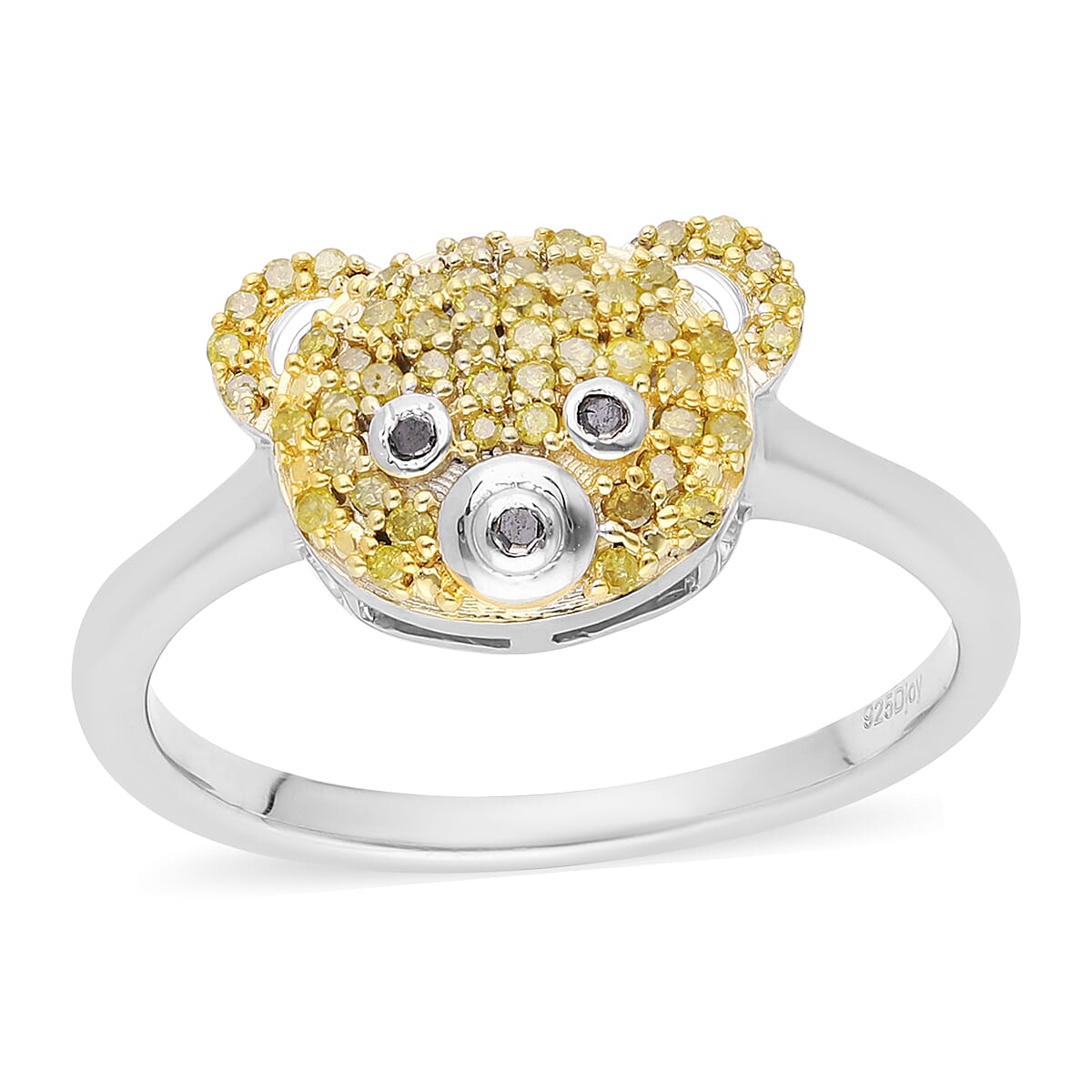 Yellow and Black Diamond Teddy Bear Ring in Platinum Over Sterling Silver (Size 9.0) 0.25 ctw