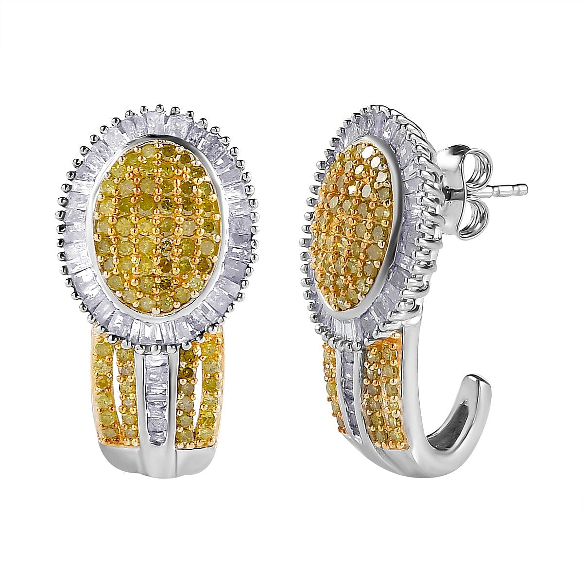 Yellow and White Diamond J-Hoop Earrings in Platinum Over Sterling Silver 2.00 ctw