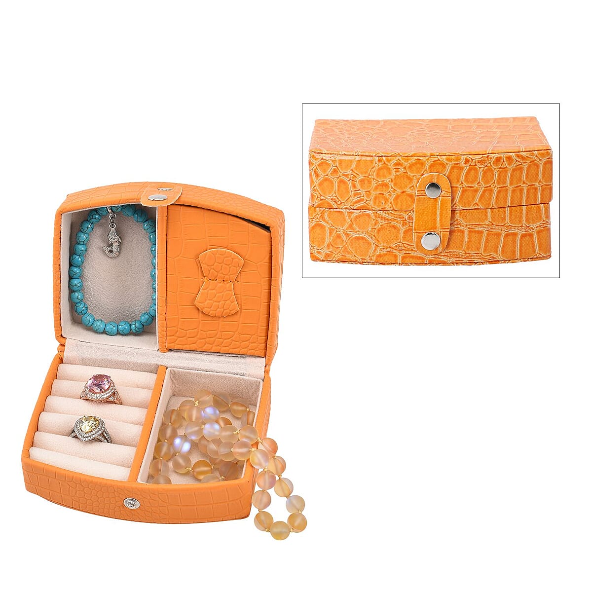 The crocodile skin pattern faux leather small travel jewelry box organizer is everything you need to keep your valuable organized. Crocodile skin pattern leather-like exterior adds a luxurious look. The box features a mirror, necklace hooks, pocket, multiple sections, and ring rows, and it makes enough space to store and safeguard your adornments. Secured with a button clasp that adds elegance and notch up the security, it's a must-buy.