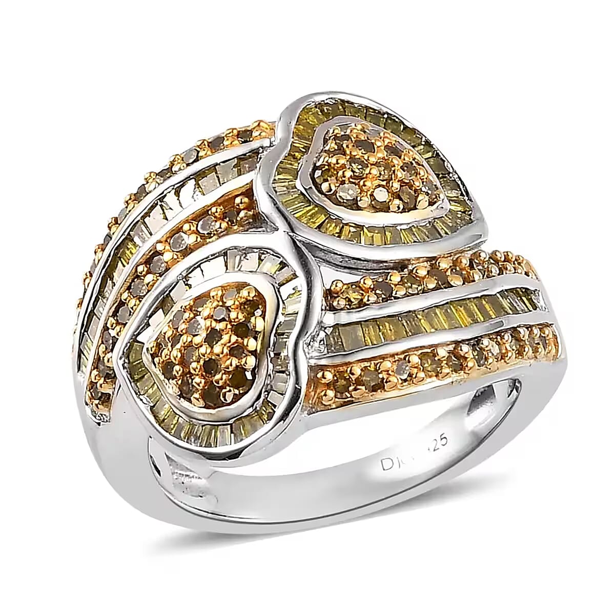 Yellow Diamond Cluster Ring, Diamond Bypass Ring, Yellow Diamond Ring, Diamond Hearts Ring, Platinum Over Sterling Silver Ring, Diamond Gift For Her, Wedding Ring 1.00 ctw