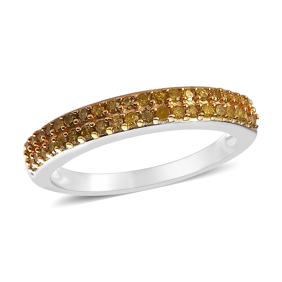 Unleash the radiance of the sun on your fingers with our yellow diamond half-eternity band ring in platinum over sterling silver. This exquisite piece is not just a ring; it's an embodiment of timeless elegance and modern sophistication. Crafted to captivate, this ring effortlessly marries the allure of yellow diamonds with the luxurious sheen of platinum over sterling silver. Elevate your everyday style with a touch of brilliance that speaks volumes.