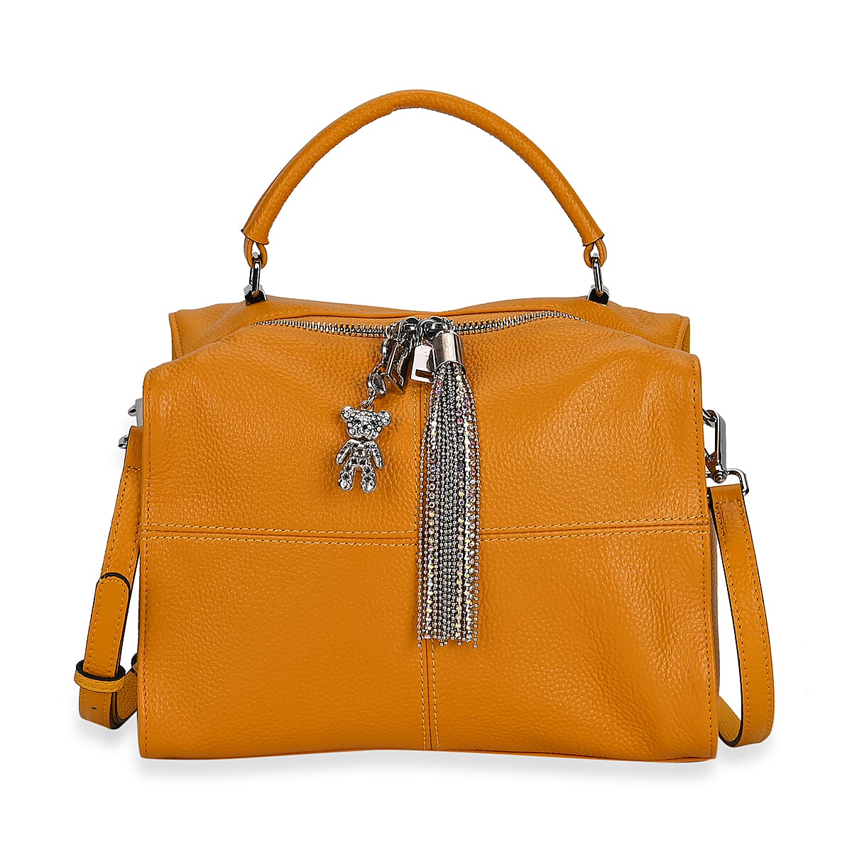 Yellow Genuine Leather Crossbody Bag with Bear Charm and Tassel Handle Drop and Two Shoulder Strap